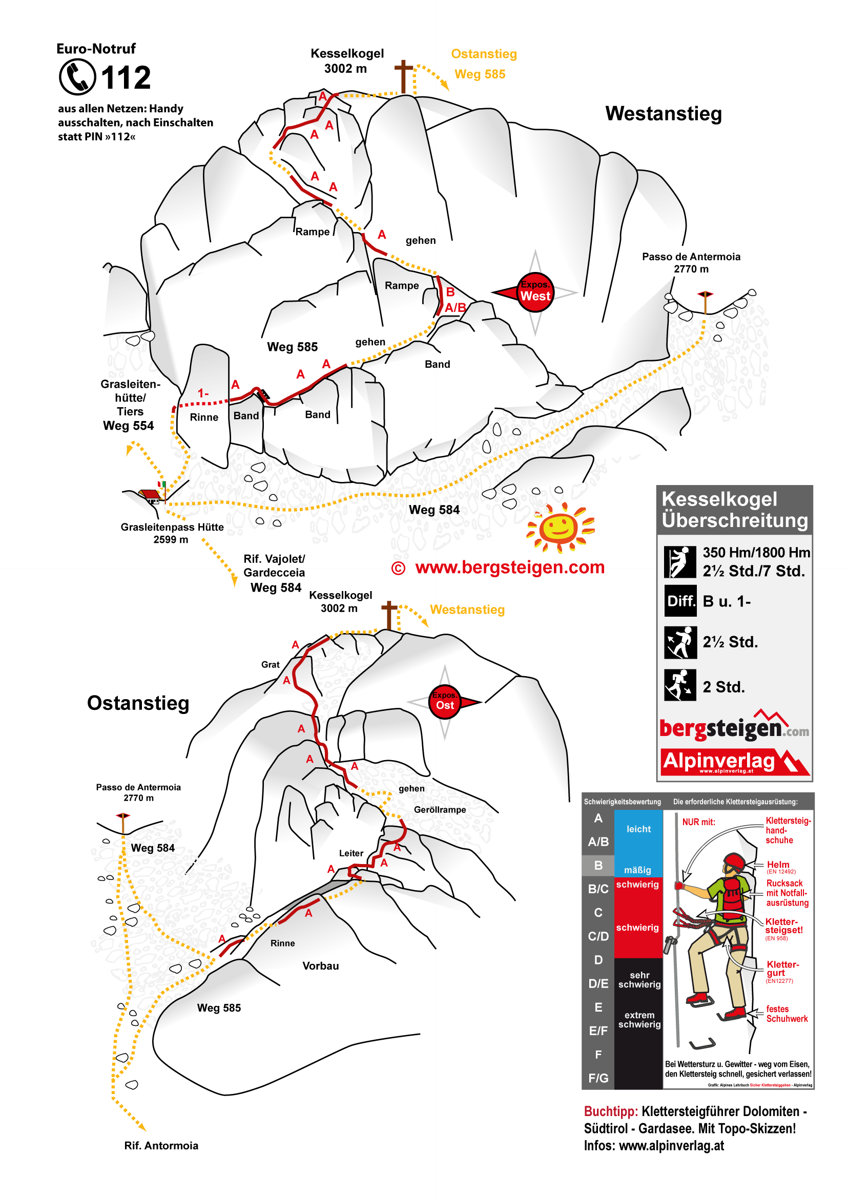 Další dny náš čeká program podobného charakteru. Budeme zdolávat ferratu, která vede až do výšky 3004 metrů na nejvyšší vrchol celé skupiny Rosengarten - Kesselkogel (obt. B). Naskytne se nám nezapomenutelný výhled na jedno z nejvíce malebných jezer Dolomit, Lago di Antermoia.